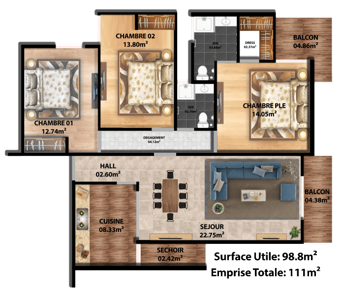 Les appartements ont une emprise totale de 111m2. Ils offrent 1 séjour + 3 chambres à coucher, une cuisine semi-ouverte, 2 salles de bain, 2 balcons donnant sur la lagune, un dressing dans la chambre principale et des placards dans les chambres secondaires.